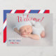 Willkommen! Süße patriotische rote, weiße und blaue Babyankündigung geschlechtsneutral. Rote, weiße und blaue Schrift. Lass allen, dass dein Freudenbündel angekommen ist.