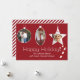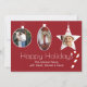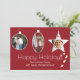 Weihnachtsgrüßkarte aus festlich rotem Foto im flachen Stil, mit drei gerahmten weißen Bildbereichen in Form von Ornamenten. Der Gruß von Happy Holiday scheint von einem lustigen roten und weißen Zuckerrohr abgehängt zu werden. Personalisieren Sie Ihre Bilder und Texte.