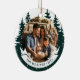 Moderne, elegante Weihnachtsschmuck. Das Design umfasst Kiefernbäume Hintergrund und Schnee , 2 Fotos, Familienname und Jahr. Perfekt als Geschenk oder Sake.