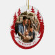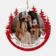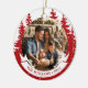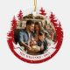 Moderne, elegante Weihnachtsschmuck. Das Design umfasst Kiefernbäume Hintergrund und Schnee , 2 Fotos, Familienname und Jahr. Perfekt als Geschenk oder Sake.