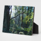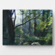 Brillante, weiße Sonnenstrahlen der Morgensonne, die von hinter dunklen Ästen in einen üppigen, grünen Sommerhwald strömen, mit massiven Efeu-Bäumen und fruchtbarem Unterholz.