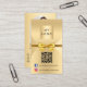 Ein Imitat goldener Hintergrund. Die Einrichtung ist mit Bogen und goldgelber Gelbe gehalten. Personalisieren Sie Ihr Firmenlogo, Ihr Foto, Ihren Namen, Ihren Titel und Ihre Kontaktinformationen. Fügen Sie Ihre Website url/link zum Qr-Code hinzu. Mit Facebook und Instagram Icons. Schwarzer Text.