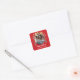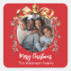 Roter Hintergrund. Personalisieren Sie Ihr eigenes Foto. Ein goldener Weihnachtsbaum baumelte als Rahmen. Fügen Sie Ihren Familiennamen hinzu.