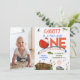 Foto Red Blue Boat Ofishally Ein 1. Geburtstag Einladung Niedlichen Jungen zum Geburtstag mit einem großen roten Wort, Angelrute, Fisch, großes Boot, Keule und mehr. Das Foto deines kleinen Jungen erscheint auf der Seite und ein schlichtes rotes Muster ist auf der Rückseite.