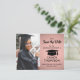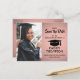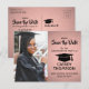 Teilen Sie die freudigen Neuigkeiten über Ihre bevorstehende Abschlussfeier sowie ein Bild mit diesen modernen, rosa und schwarz Save the Date Postkarteneinladungen. Foto und alle Texte sind einfach zu anpassen. Das Design umfasst rosafarbene Rosengold-Imitate, metallische Folie, handgeschriebene Schriftzeichen-Kalligraphie, modernen minimalistischen Typografen-Graduierungsnamen, Klassenjahr und Schule sowie ein Foto Ihrer Wahl, wie z.B. ein Seniorbild oder ein Bild aus der Anlaufzeremonie. Diese elegante Abschluss-Ankündigungskarte ist eine stilvolle und schicke Art, um Ihre Feier zu beginnen.