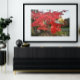 Das Poster im Glossy-Stil ist farbenfroh, mit einem Foto-Bild von hellen, roten Ahornfarben-Blätter und einem roten Miniaturschrein in einem japanischen Garten. Passen Sie Ihre Poster-Druckgröße nach Wunsch an. Foto: Point Defiance Park Japanischer Garten