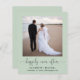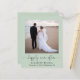 Schick budgetfreundliches schlauer grüner Umbau oder private Hochzeitsankündigung und Einladung zum Empfang. Die Vorderseite zeigt Ihr Foto, "glücklich immer nach" geschrieben in einem stilvollen Skript mit Swashes und Ihre Vornamen und Hochzeitstag und Ort. Auf der anderen Seite, personalisieren Sie Ihre Hochzeitsankündigung detaillierter, fügen Sie einen Empfang oder eine Party Einladung hinzu und unterschreiben Sie Ihre verheirateten Namen in einem signaturähnlichen Skript.