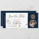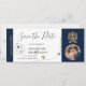 Destination Beach Wedding Boarding Pass Ticket Gold Flugzeug Save the Date mit Herz und Flugzeug Ikone mit Imitaten Gold Wappen. Foto hinzufügen