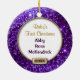 Adorable runde Keramik Baby's First Weihnachtsmassage Foto Rahmen-Ornament. Die Vorderseite hat einen Platz für Ihr eigenes hochgeladenes Foto und das Jahr, während die Rückseite für Sie bereit ist, um mit dem Namen und Jahr des Babys zu personalisieren. Das Geschenk ist perfekt für Großeltern und wird Jahr für Jahr ein geschätzter Sake sein.