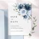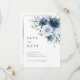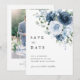 Eine moderne und elegante staubblaue und marineblaue florale "Save the Date"-Karte mit einem weichen Wasserfarbenstrauß auf der Vorderseite und einer vollflächigen Fotografie auf der Rückseite für Ihr Lieblings-Hochzeitsfoto.