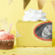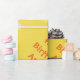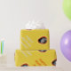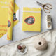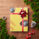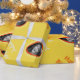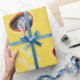 Ein gelbes Verpackungspapier, in dem Sie ein individuelles Foto und einen persönlichen Gruß hinzufügen können. Foto erscheint in einem orangefarbenen Kreis. Text ist entweder orange oder sehr leicht grau/silber.