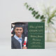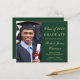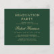 Moderne, preisgünstige Ankündigung und Party Einladung eines grünen Uni-Abschlusses mit einem Foto des Absolventen, seinem Namen und Klassenjahr in einem eleganten, leicht vergoldeten Drehbuch und seiner Universität, Hauptfach und Ehren. Fügen Sie auf der Rückseite die Details zum grad-Party hinzu.