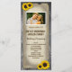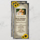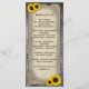 Vintage Brauerei Sonnenblumen Hochzeitsprogramme - mit einem Hintergrund aus verwittertem Scheunenholz mit Vintag zerrissenem Papier überzogen, verziert mit vier Sonnenblumen. Ändern Sie das Demo-Foto in Ihr eigenes.