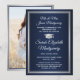 Teilen Sie die Freude an einer High School oder Uni-Abschluss mit diesen benutzerdefinierten Foto Marine blau, weiß und silber Ankündigungen. (IMAGE PLACEMENT TIP: Eine einfache Möglichkeit, ein Bild genau so zu zentrieren, wie Sie es gewollt haben, ist es, es einzuschneiden, bevor Sie es auf die Zazzle-Website hochladen.) Diese formale Stilvorlage enthält die Namen von Eltern und Absolventen sowie alle von Ihnen gewünschten Formulierungen, wie Party Einladungen, Sonderehren, Studientitel, Lieblings-inspirierendes Zitat, Kontaktinformationen für Absolventen, künftige Bildungen oder neue Stellenangebote. Der gesamte Text ist einfach zu personalisieren. Das Design besticht durch einen modernen dunkelblauen Hintergrund, Imitate mit silberner Folienkappe und Mörserpappe, elegante Schriftzeichen, traditionelle Typografie und ein Foto Ihrer Wahl, wie z.B. ein Seniorenbild oder ein Bild aus der Anlaufzeremonie. Bitte beachten Sie, dass Silber gedruckt ist, nicht metallische Folie. Diese Abschluss-Ankündigungskarten sind eine schicke und trendige Art, Ihre Feier mit Freunden und Familie zu teilen. Herzlichen Glückwunsch an den Absolventen!