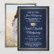 Teilen Sie die Freude an einer High School oder Uni-Abschluss mit diesen benutzerdefinierten Foto Marine blau, gold und weiß Ankündigungen. (IMAGE PLACEMENT TIP: Eine einfache Möglichkeit, ein Bild genau so zu zentrieren, wie Sie es gewollt haben, ist es, es einzuschneiden, bevor Sie es auf die Zazzle-Website hochladen.) Diese formale Stilvorlage enthält die Namen von Eltern und Absolventen sowie alle von Ihnen gewünschten Formulierungen, wie Party Einladungen, Sonderehren, Studientitel, Lieblings-inspirierendes Zitat, Kontaktinformationen für Absolventen, künftige Bildungen oder neue Stellenangebote. Der gesamte Text ist einfach zu personalisieren. Das Design besticht durch einen modernen, blauen Hintergrund, Imitate mit goldfarbener Folienkappe und Mörserpappe, elegante Drehkalligraphie, traditionelle Typografie und ein Foto Ihrer Wahl, wie z.B. ein Seniorenbild oder ein Bild aus der Anlaufzeremonie. Bitte beachten Sie, dass Gold farblich gedruckt ist, nicht metallische Folie. Diese Abschluss-Ankündigungskarten sind eine schicke und trendige Art, Ihre Feier mit Freunden und Familie zu teilen. Herzlichen Glückwunsch an den Absolventen!