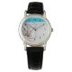 Eine Uhr mit einem wunderschönen Foto. Tropisch blaues Wasser und schäumendes Surfen im Hintergrund. Eine Sammlung von Muscheln und Stielen Set auf einem weißen Sandstrand.