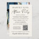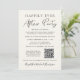 Chic light cream elopement or small wedding announcement and wedding reception or celebration party einladung. The front feature "Happil Ever After Party" in a mix of simple typography and a modern script, and you can customize your message and einladung in more detail, input your wedding address to create a QR code for your guests to scan for information and to RSVP online, and add your Names in hat Like Script unterschrieben. The reverse side feys your favorite wedding foto, your first names and wedding date.