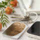 Schlüsselanhänger mit Foto von Russet-Kartoffel auf weißem Teller