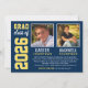Mit dieser Ankündigung und Party Einladung des Abschlusses kündigen Sie Ihre zwei Klassen von 2022 High School Absolventen im Stil. Die zweiseitige Karte ist für zwei Klassen konzipiert und weist ihre Fotos mit einem einfachen und männlichen Design mit Sport Jersey inspiriert Schrift auf. Die Farben Navy Blau, Gelb und Weiß können an Ihre Schulfarben angepasst werden. Ein Muster aus weißen Streifen zieht sich an der Rückseite der Karte an. *Foto Tipp: Zuschneiden Sie Ihre Fotos vor dem Hochladen auf eine quadratische Form.