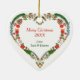Auf diesem Ornament steht Ihr eigenes Foto im Zentrum eines hübschen herzenförmigen Weihnachtsschadens. Der Kranz besteht aus Holiday-Bildern, darunter Kiefernzapfen, heilige Sprigs, Lollips, Baumbulben und Weihnachtsbäume. Alles ist auf einem weißen Hintergrund platziert. Die Rückseite des Ornaments hat den gleichen Herzkranz, mit benutzerdefinierten Textfeldern in Rot und Grün, damit Sie anpassen können.