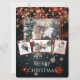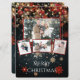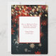 Hübsche Urlaubskarte mit hübschen Schneeflocken in Rot und Gold, Saitenbeleuchtung und roten Ornamenten auf schwarzem Hintergrund. Fügen Sie Ihre Fotos hinzu.