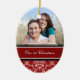 Fotoverzierung der Paare 1. Weihnachtskundengerecht mit Ihrem eigenen Foto, Namen und Datum im eleganten Rot, klassisches Blumendamastschwarzweiss-muster. Eine stilvolle Weise, Ihren Weihnachtsbaum oder Zuhause für die Feiertage zu verzieren. Die perfekte Weise, sich an Ihr erstes Weihnachten als Paar zusammen zu erinnern.