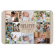 Foto Collage Magnet mit 10 Ihrer Lieblings-Fotos. Die Formulierung in der Mitte lautet "glaube sei glücklich" und ist in fett gedruckter Typografie und lässiger, dünner Schriftart-Schrift geschrieben. Die Fotovorlage ist für Sie ein Set, 10 Bilder hinzuzufügen, die in Landschafts-, Quadrat- und Porträtbildern dargestellt werden, um Ihnen so viel Flexibilität wie möglich zu geben. Dieser Foto Magnet hat eine neutrale Farbpalette aus Mandelbeige, Mocha-Braun und Terracotta.