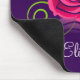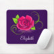 Eine einfache Abbildung einer rosa Rose mit grünen Blütenblättern und einem Wirblen Stamm auf einem lila Hintergrund. Passen Sie Ihren Namen oder anderen Text an.
