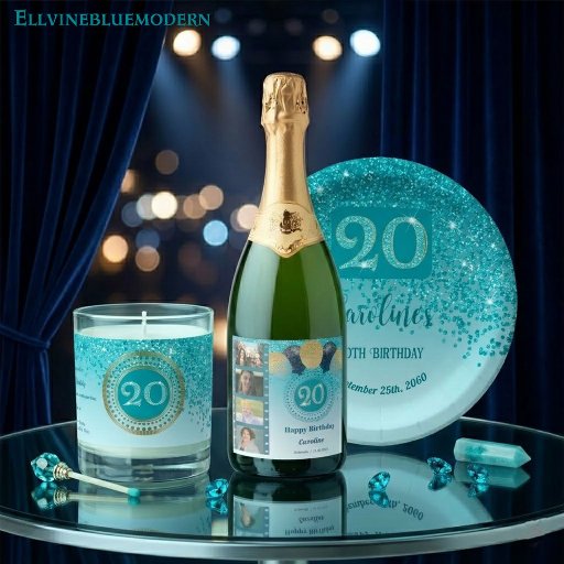 Überraschen Sie Ihre Gäste mit diesen eleganten Champagner Labels mit einem stilvollen aquamarinen blauen Glitzer mit einem einzigartigen Glitzer Nr. 20 und vier individuellen Bildern.