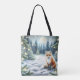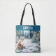 Personalisierte Weihnachtsstüte. Eine niedliche ai Aquarell Illustration eines Fuchses, der in einer kalten Winternacht in einem magischen Winterwunderland im Schnee sitzt.
