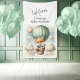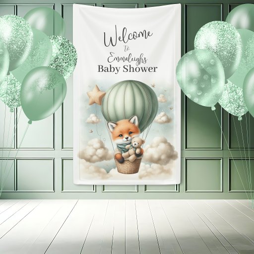 Adventure themed baby shower Welcome banner with an adorable fox holding a teddy bear riding in a green hot air balloon. The watercolor green sky has white clouds with surrounding gold stars. Template included.