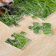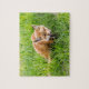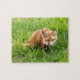 Dieser bezaubernde rote Fuchskub (Kit) sitzt im großen Gras außerhalb seiner Höhle.