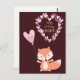 Niedlicher kleiner Fuchs mit einem rosa Ballon mit den Worten "Happy Birthday FOXY", geschrieben in einem Herzen von bunten Herzen.