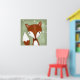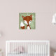 Ein digitales Bild eines skurrilen Fuchses wird vor dem grünen holzgetönten Hintergrund gesehen. Kleine weiße Blume werden auf Weinreben in der rechten Ecke gesehen. Ein schönes Bild in sanften Farbtönen ist perfekt für jeden Waldbereich, egal ob es sich um ein Baby-Kinderzimmer, eine Tagesstätte oder ein Spielzimmer handelt.