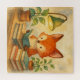 Aquarellbild eines bezaubernden Fuchses, der ein Buch liest, das von einem Schreibtisch mit gestapelten Büchern, einer Vintagen Lampe und grünen getöpften Pflanze umgeben ist.