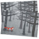 Ein wilder roter Fuchs steht unter Bäumen in einem dunklen Wald. Ein Landschaftsbild für Tiere, Natur und Wildtiere. Originelle Kunst von Nic Squirrell.