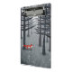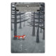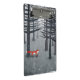 Ein einziger wilder roter Fuchs steht unter den Kiefern in einem dunklen Wald. Für Natur, Wildtiere und Tierfreunde.