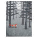 Ein wilder roter Fuchs steht unter Bäumen in einem dunklen Wald. Ein Landschaftsbild für Tiere, Natur und Wildtiere.
