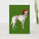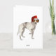 Diese Weihnachtskarte zeigt einen Foxhound, der eine skurrile Weihnachtsmannmütze in einer stehenden Pose trägt, die den Betrachter direkt anblickt. Grußtext ist leicht personalisiert.