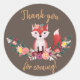 Wasserfarbener Fuchs sitzend auf einem Blumenrand mit Blume auf dem Kopf rund dank einem Aufkleber. Brauner Hintergrund mit dunklen Goldbriefen und dekorativem handgeschriebenem Schriftart.