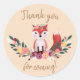 Wasserfarbener Fuchs sitzend auf einem Blumenrand mit Blume auf dem Kopf rund dank einem Aufkleber. Dusty Gray Hintergrund mit dunkelgoldenen Buchstaben und dekorativen handgeschriebenen Schriftart.