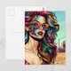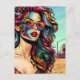 Postcard, um einfach zu sagen hi, oder für jeden Anlass. Einzigartige Ai-Kunst, die eine schöne moderne Frau mit farbenfrohen Haaren und Sonnenbrillen in einem Bikini am Strand darstellt, in dem sie reflektiert wird. Pop Art Comic Stil gebrochen Kunst.