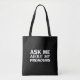 Frag mir über meine Pronouns schwarz-weiß moderne Typografie lgbtq Gay Pride Tote Bag. Weißer Text auf schwarzem Hintergrund.
