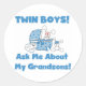Zwei Babybunnies in Baseballkappen, eine blaue Polka Dotinet, ein Herz, das "It's 2 Boys!" und blauer Text, der "Twin Boys! Frag Me About My Grandsons!" wird auf diesen stolzen neuen Großeltern von Zwillingsjungen T - Shirt, Tasse, Mousepads, Buttons, Magneten, Aufklebern, Totensäcken, Schlüsselanhängern und anderen Gegenständen vorgestellt.