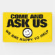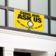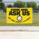 Frag uns wir sind glücklich, zu helfen, Slogan lächeln Kunden-Service-Verbindung und Interaktion Förderung Banner. Lass deinen Kunden oder der Öffentlichkeit, dass du mit diesem hellgelben, schwarz-weiß gefragt Banner bei Fragen und Kundenservice zur Verfügung stehst. Die Hintergrundfarbe kann bei Bedarf auf Ihre Firmenfarben geändert werden. Weitere passende Artikel sind verfügbar. Entworfen von www.mylittleeden.com