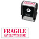 Einfache Briefmarke. Das Design zeigt ''FRAGILE HANDLE WITH CARE'' in modernem Schriftart in roter Hauptstadt auf weißem Hintergrund.