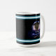 Ein blaues und lila Fraktal-Bild, das dem Helm und den Schultern eines Astronauten auf einem sternförmigen Hintergrund ähnelt. Fügen Sie auf der Rückseite Ihren eigenen Text hinzu.