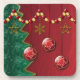 Fraktale bilden dieses stilisierte Weihnachtsdesign. Eine abgestufte rote Kulisse, ein würfeliger grüner Baum, goldene Sterne und Schneeflocken, die an einem Strang aus roten und goldenen Perlen hängen, und drei rote Kugeln mit einem wirbelnden goldenen Design, die vorne hängen.