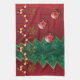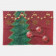 Fraktale bilden dieses stilisierte Weihnachtsdesign. Eine abgestufte rote Kulisse, ein würfeliger grüner Baum, goldene Sterne und Schneeflocken, die an einem Strang aus roten und goldenen Perlen hängen, und drei rote Kugeln mit einem wirbelnden goldenen Design, die vorne hängen.