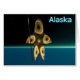 Ein braunes Fraktal-Bild, das auf einen hochstilisierten Inuit-Jäger hinweist, der traditionelle Pelzkleidung trägt und einen Harpunen mit Elfenbeinkopf trägt. Das Bild ist auf einem Hintergrund überlagert, der den dunklen polaren Winter darstellt. "Alaska" erscheint in blau-weiß.